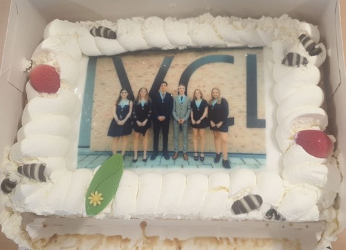 De nieuwe leerlingenbond biedt traditiegetrouw een taart aan de schoolleiding aan. Op een goede samenwerking dit schooljaar!