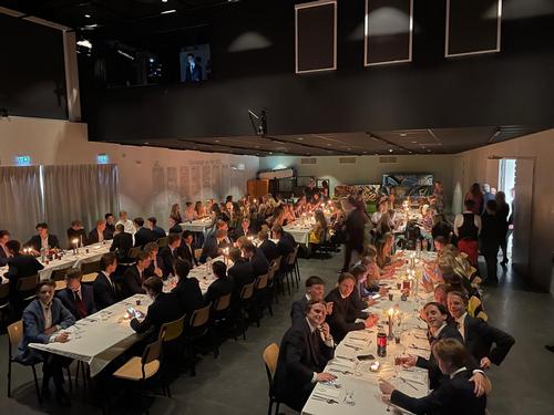 De aula was omgetoverd tot een restaurant; de leerlingen zagen er in hun pakken en jurken fantastisch uit en werden deze avond bediend door een aantal docenten.