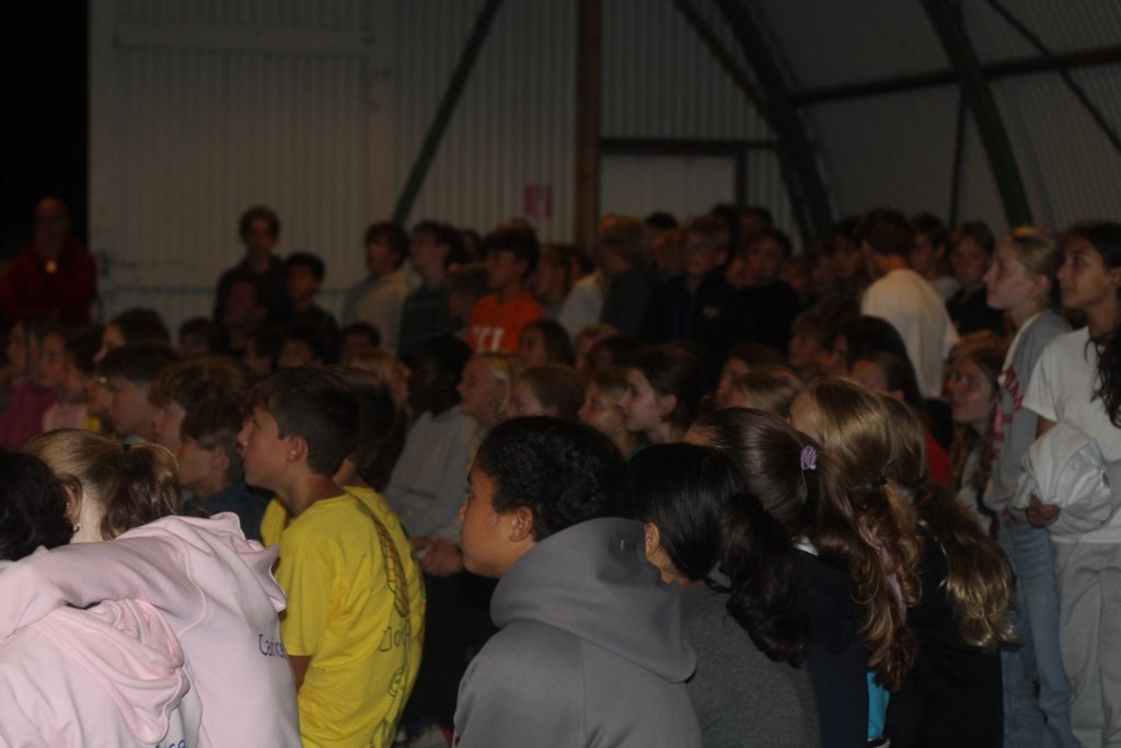 Door hevige regenval hebben wij deze avond gezellig overdekt gegeten in de loods. Mexicaanse wraps en vanille-ijs toe. En daar dus ook gezongen. Als het dan laat op de avond toch nog droog wordt, kunnen we voor de laatste donkere uren van de dag naar buiten, om te weerwolven en lasergamen. Als de bruggers naar bed gaan, is het snel stil in de tenten.